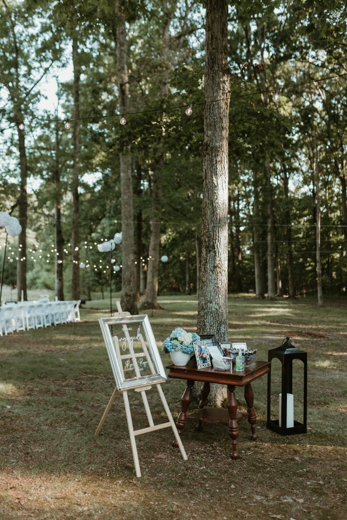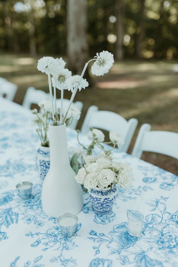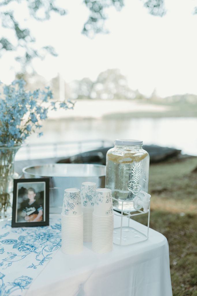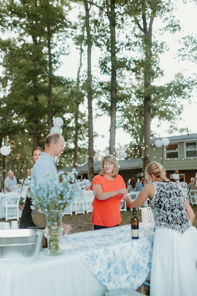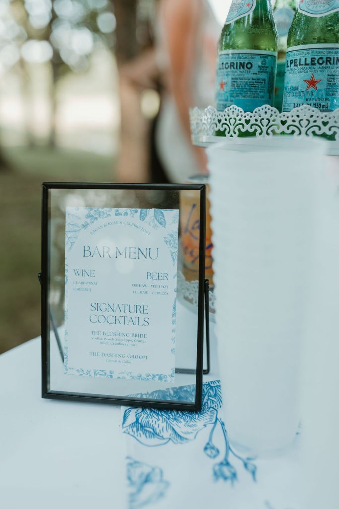 The “Something Blue” theme was brought to life with intentional decor that flowed throughout the event set up. From the blue floral accent table cloths and floral lanterns to the custom designed signage, every element worked in cohesion to elevate the back yard into a beautiful evening of celebration.