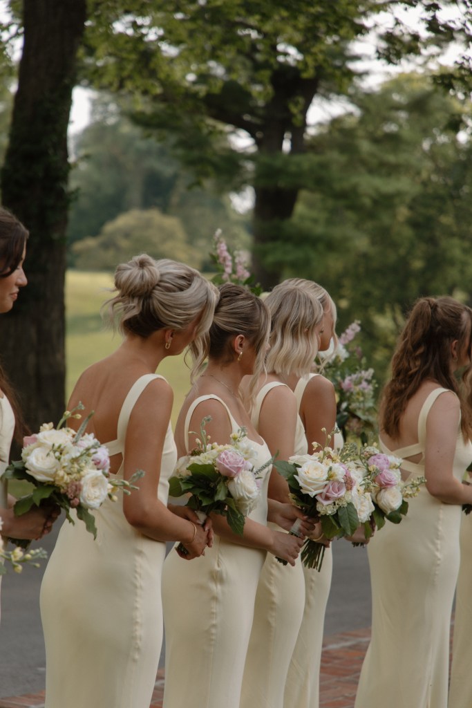 As the ceremony commenced, the outdoor setting came alive with a vibrant array of pink, yellow, and green florals, perfectly complementing the bridesmaids’ adorned in pastel yellow. The air was filled with enchanting melodies as a harpist serenaded the guests, setting a magical tone for the day.
