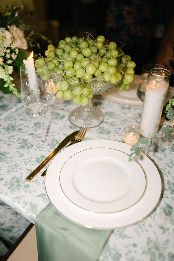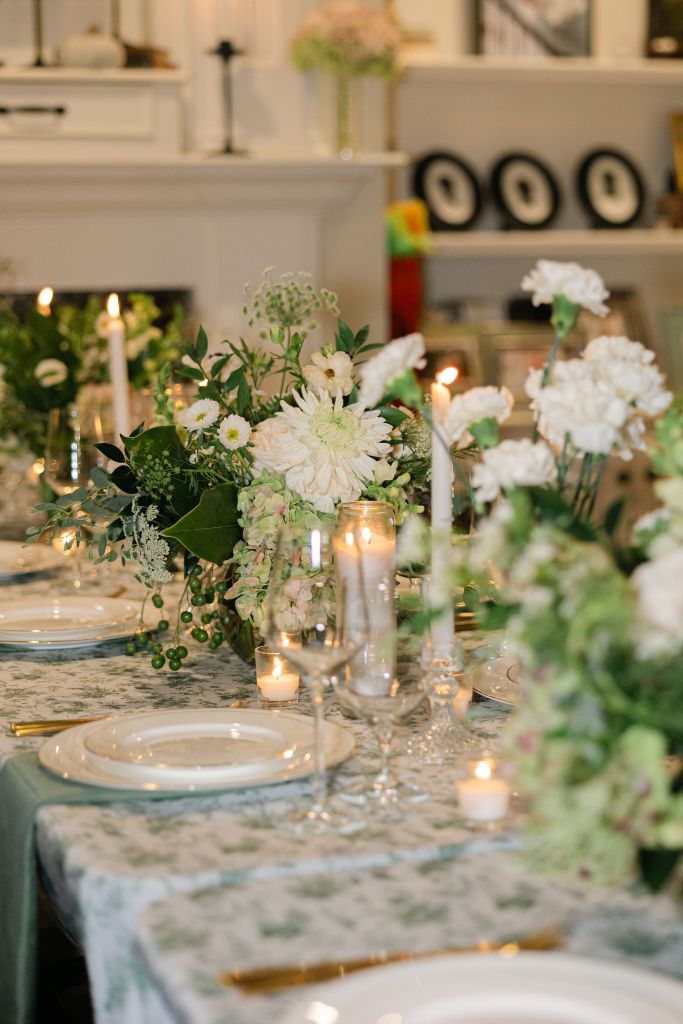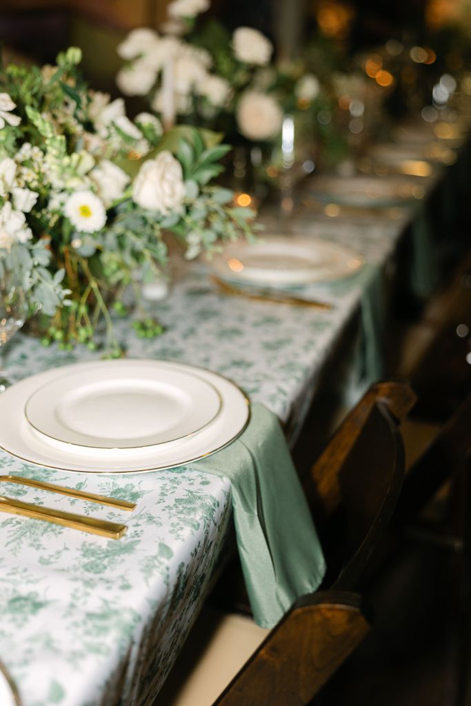 The design was built around a set of gorgeous green floral tablecloths I had been admiring for some time. By intentionally incorporating grand floral arrangements and vintage-style tableware, we were able to create an atmosphere that was both elegant and timeless—just like Stephanie.